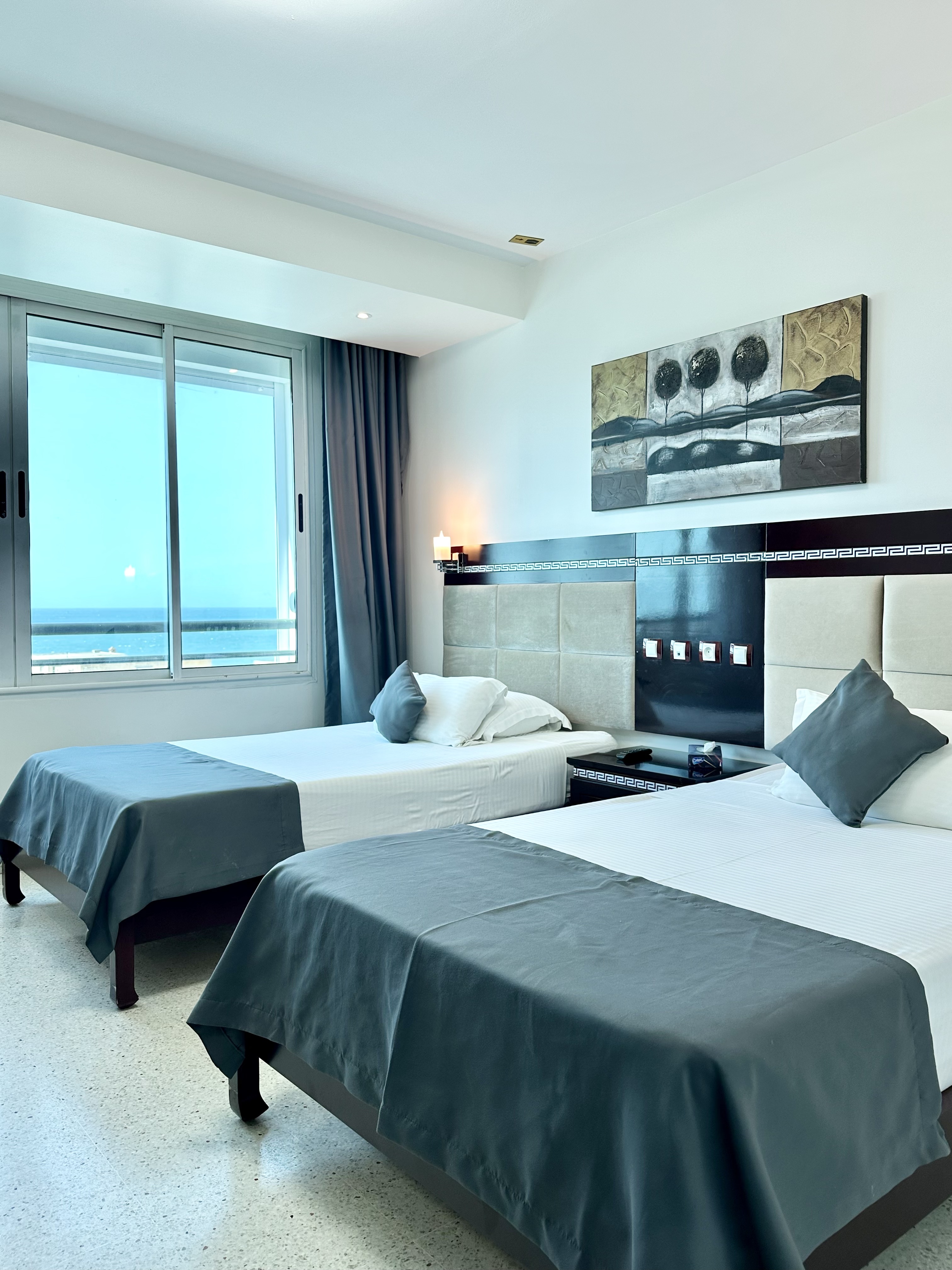 There is also a hospitality tray with a kettle, a fridge (minibar) and a safe.